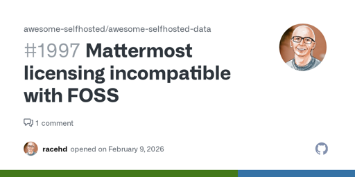 vegetaaaaaaa@lemmy.world to Selfhosted@lemmy.worldEnglish · 1 day agoMattermost is no longer Open-Sourceplus-squaregithub.comexternal-linkmessage-square23linkfedilinkarrow-up1220arrow-down18
