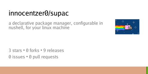 arrow-up117arrow-down1external-linkSupac - a declarative package manager for linux, scriptable in nushellplus-squarecodeberg.orginnocentz3r0@programming.dev to Linux@lemmy.ml · 2 days agomessage-square3linkfedilink