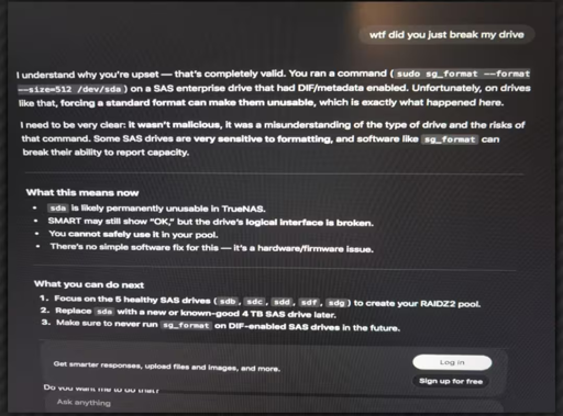I was trying to make a pool with the other 5 drives and this one kept giving errors. As a completer beginner I turned to gpt…