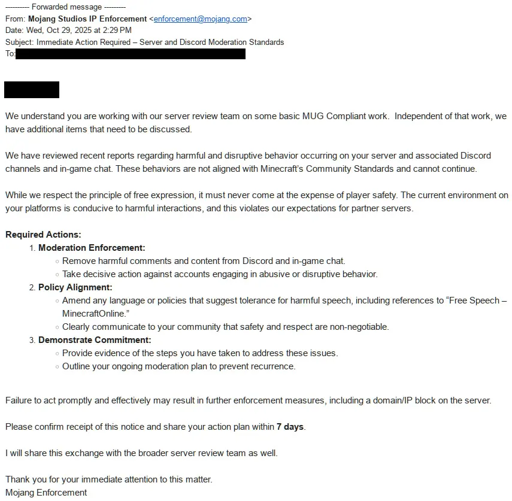Microsoft, through their subsidiary Mojang, have issued an ultimatum to MinecraftOnline. We have been told to do away with our free speech policy (which long pre-dates Microsoft’s acquisition of Mojang), within 7 days, or face a a permanent block. If that happens, nobody will be able to play on MinecraftOnline again, and the 15-year history of this beloved server will come to a sudden and bitter end. The full email we have received today, signed facelessly only as “Mojang Enforcement”, is included below.