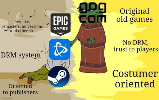 I think it’s lumped in because Steam sells games with DRMs, but GOG on the other hand will not sell games that come with any type of DRM at all.